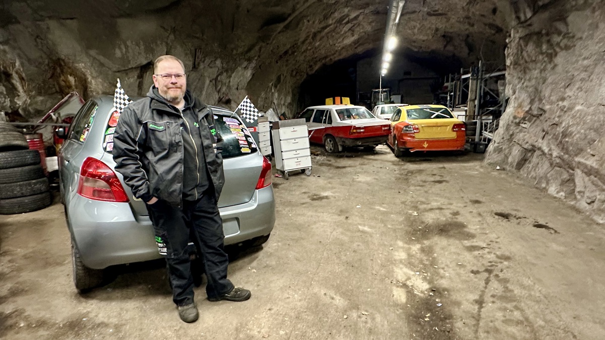 Klubbens leder Andreas Lillerødvann Hansen viser frem noe av bilene klubben eier